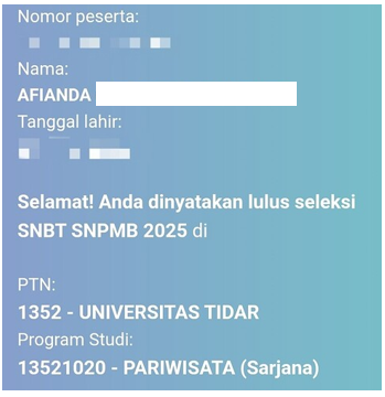 Di jalur SNBT, aku memilih S1 Pariwisata Universitas Tidar sebagai pilihan pertama dan S1 Teknik Pangan Universitas Tidar sebagai pilihan kedua. Setelah ujian selesai, masa penantian pun kembali dimulai. Hari pengumuman menjadi hari yang paling menegangkan dalam hidupku. Dengan tangan bergetar, aku membuka laman hasil seleksi. Saat tulisan “Selamat! Anda diterima di S1 Pariwisata Universitas Tidar” muncul di layar, air mataku langsung menetes. Aku tidak bisa berkata apa-apa selain Alhamdulillah. Semua perjuangan, doa, dan kelelahan akhirnya terbayar lunas.