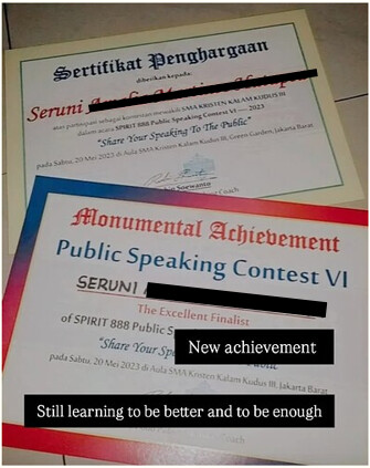 Dalam kegelisahan saya terhadap lomba pertama terdapat bimbingan dan dukungan dari mentor Public Speaking saya, beliau selalu memberikan kata-kata motivasi, dan memberikan kritik dengan solusi, yang menjadikan saya lebih percaya diri untuk yakin ikut lomba Public Speaking pertama kali, yaitu Public Speaking Competition antar sekolah.