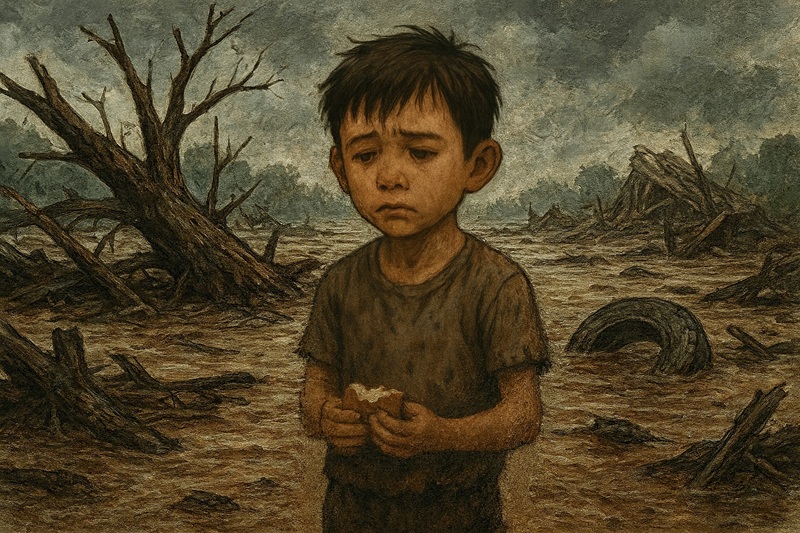 Malam itu, desa mereka tenggelam. Di posko pengungsian, Satria duduk bersandar pada dinding sekolah dasar yang kini berubah fungsi menjadi posko darurat. Lantainya dingin, bau lumpur bercampur dengan bau keringat dan air hujan. Di sekelilingnya, orang-orang banyak yang menangis, terdiam, atau saling menyalahkan. Ada yang kehilangan rumah,ada yang kehilangan harta, ada yang kehilangan ternak, bahkan ada yang kehilangan anggota keluarga.