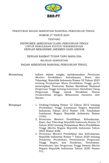 19 Desember 2024 yang lalu, BAN-PT telah menetapkan Peraturan Badan Akreditasi Nasional Perguruan Tinggi Nomor 27 Tahun 2024 tentang Instrumen Akreditasi Ulang Perguruan Tinggi untuk Perolehan Status Terakreditasi dengan Mekanisme Asesmen oleh Asesor. Dengan demikian, maka peraturan ini hanya mengatur mengenai perolehan status terakreditasi pada perguruan tinggi.