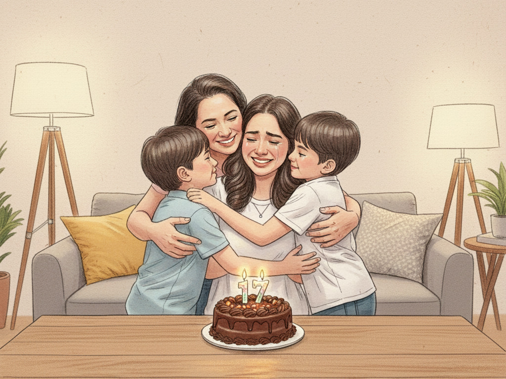 Begitu tiba di ruang keluarga, Aca terkejut. Di meja ada kue dengan lilin menyala dan beberapa makanan kesukaannya. Ibu dan adik-adiknya tersenyum lebar dan berkata, “Kami semua mengucapkan selamat ulang tahun untuk Kak Aca.” Mereka langsung memeluknya erat. “Aku benar-benar merasa terkejut. Aku kira tidak ada apa-apa,” kata Aca sambil tertawa. “Selamat ulang tahun, Ca. Ibunya berkata pelan, Ibunya berucap perlahan, “Ibu ingin kamu tetap sehat dan semakin pintar.”