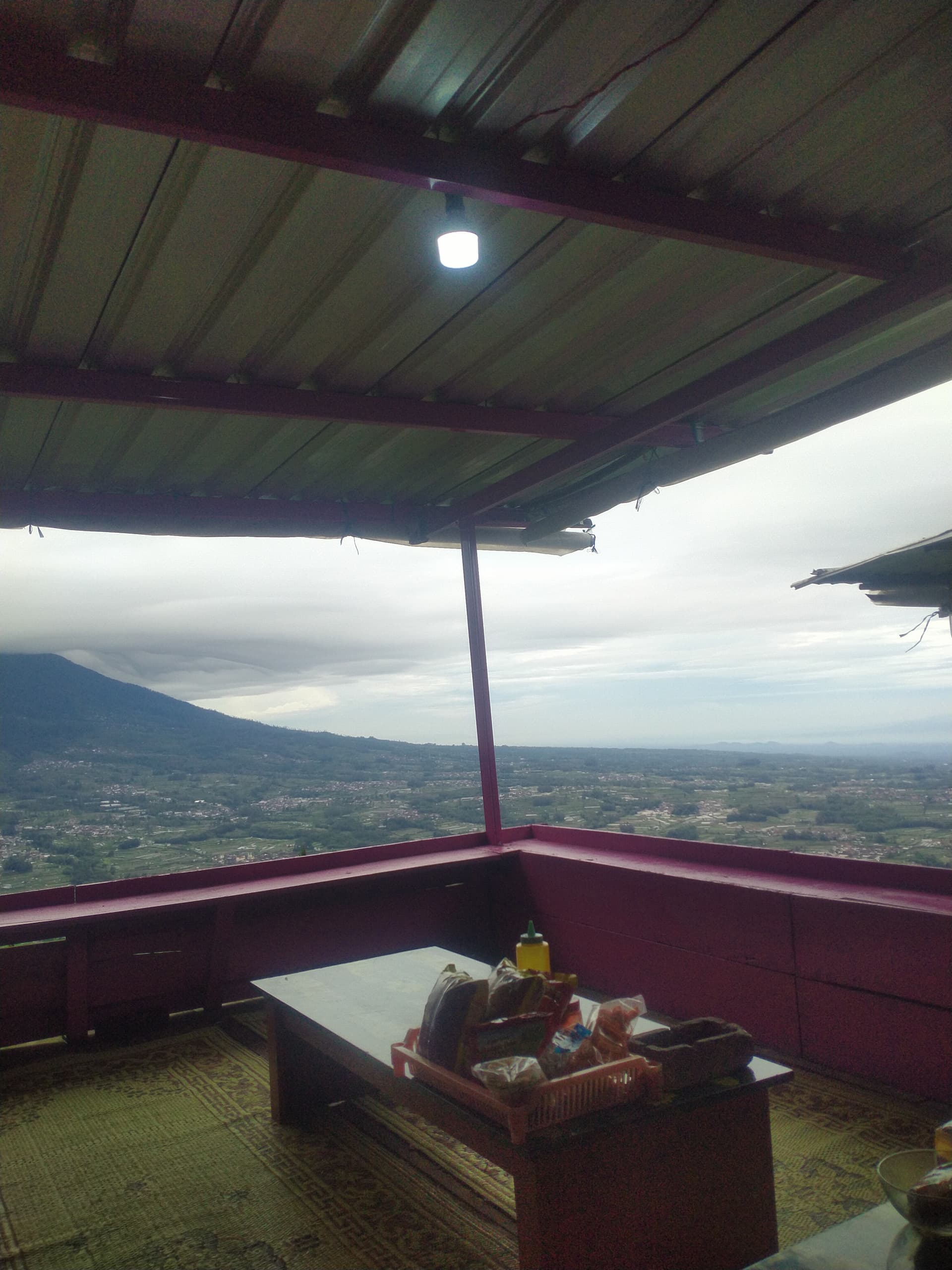 Di Dalangan banyak sekali orang yang menuju puncak Gunung Telomoyo dan kembali turun dari puncak Gunung Telomoyo. Untuk menuju puncak Gunung Telomoyo, pengunjung diharuskan membeli tiket sebesar Rp. 15.000/orang. Setelah membeli tiket, kami langsung menuju puncak Gunung Telomoyo menggunakan motor. Jalur menuju puncak Gunung Telomoyo sangat menanjak dan berkelok-kelok, sering kali ada beberapa mobil jeep yang membawa beberapa penumpang turun gunung. Aku berpegangan erat dihandle motor karena takut jatuh. Kami berhenti di warung-warung lesehan untuk beristirahat dan makan. Sambil makan, aku memfoto beberapa pemandangan dari warung lesehan karena pemandangannya sangat bagus. Setelah makan kami lanjut untuk menuju puncak Gunung Telomoyo.