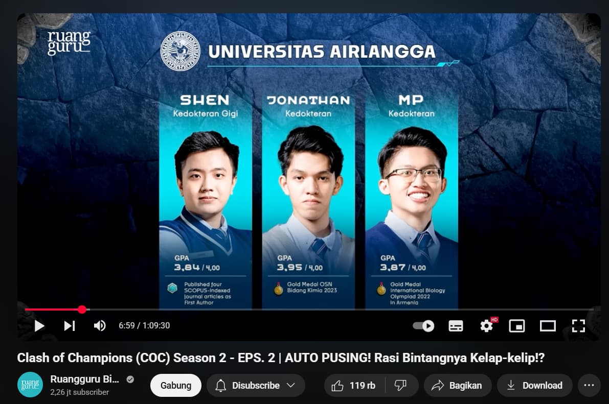 Program Clash Of Champions menghadirkan mahasiswa yang berprestasi dari berbagai universitas ternama dalam negeri dan luar negeri. Prestasi-prestasi mereka membuat saya kagum mulai dari publikasi 24 jurnal bahkan ada yang terbit di Scopus, Juara di International Physics Olympiad dan bidang lainnya.