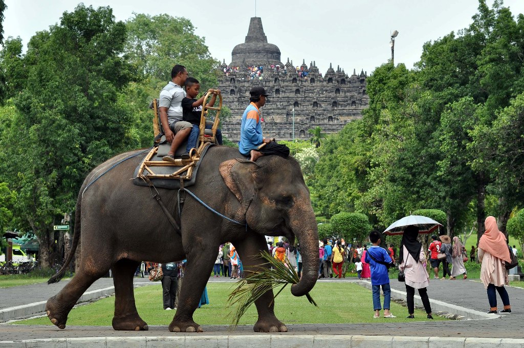 Dulunya, sebelum seperti sekarang ada wahana menaiki gajah dan ada lima gajah sebagai atraksi wisata, namun sekarang kelima gajah tersebut sudah dipindahkan di Semarang Zoo dan Gembira Loka Zoo di Yogyakarta. Kelima gajah tersebut bernama Bona, Endra, Eca, Lisi, dan Zella. Kelima gajah itu dipindahkan sebagai upaya konservasi dan perawatan yang lebih baik kepada mereka, agar pengelola Candi bisa fokus untuk mengelola candi.